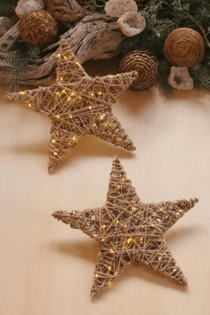 10. Wrap Rustic Twine Stars with Fairy Lights for Warm Winter Glow