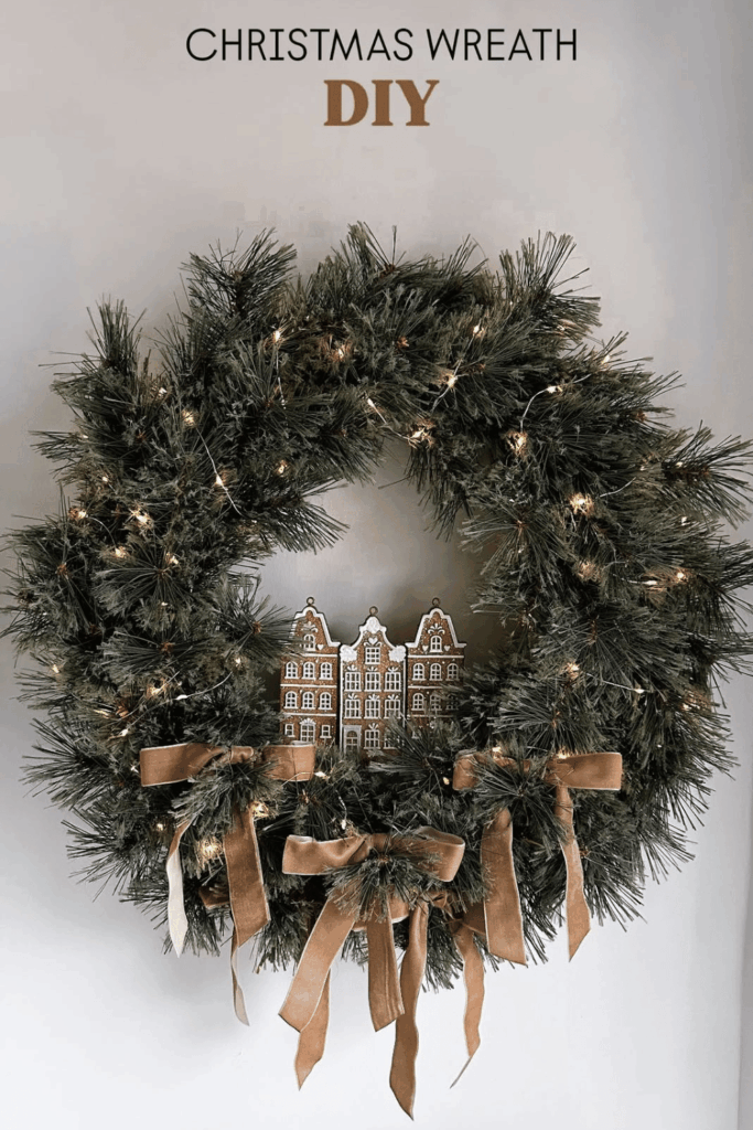40. DIY a Classic Christmas Wreath with Ribbons and Fairy Lights for Elegant Door Decor