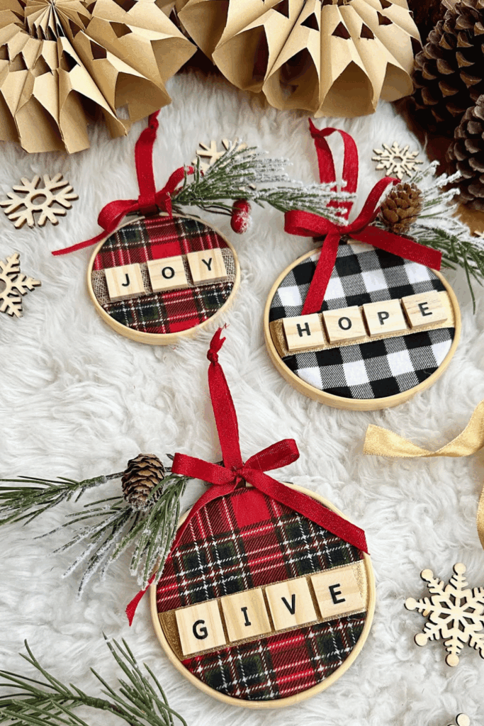 41. Cutest Plaid Scrabble Tile Ornaments to Spell ‘Christmas Cheer’