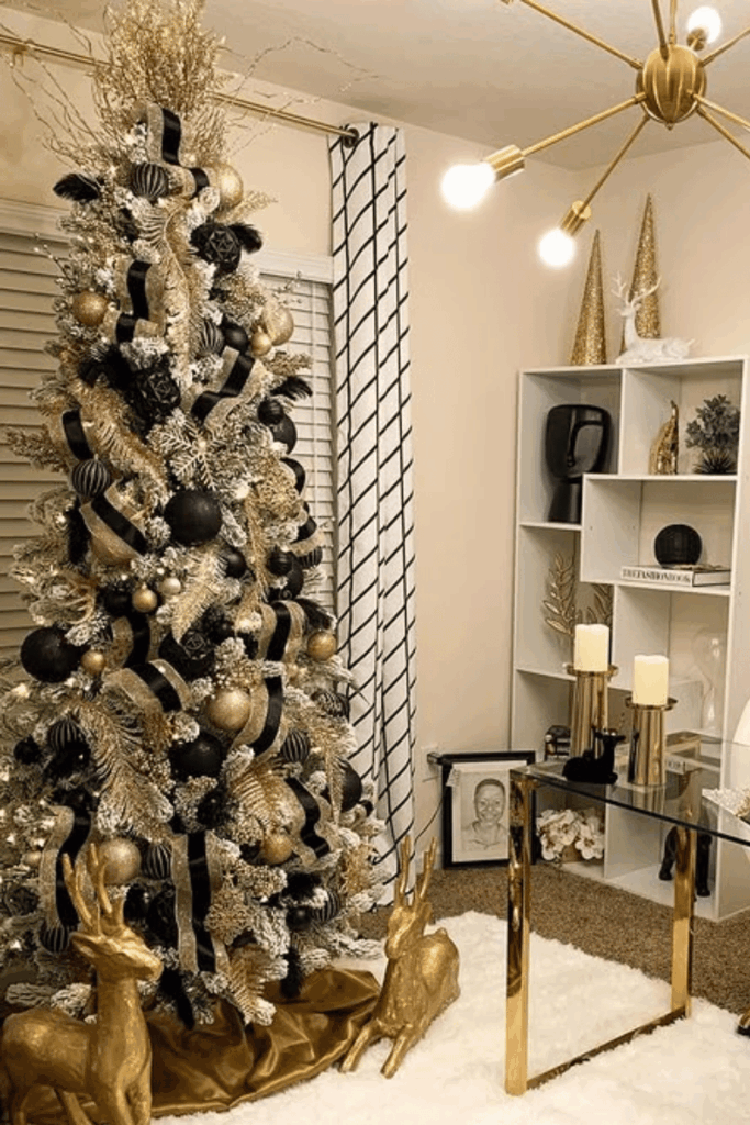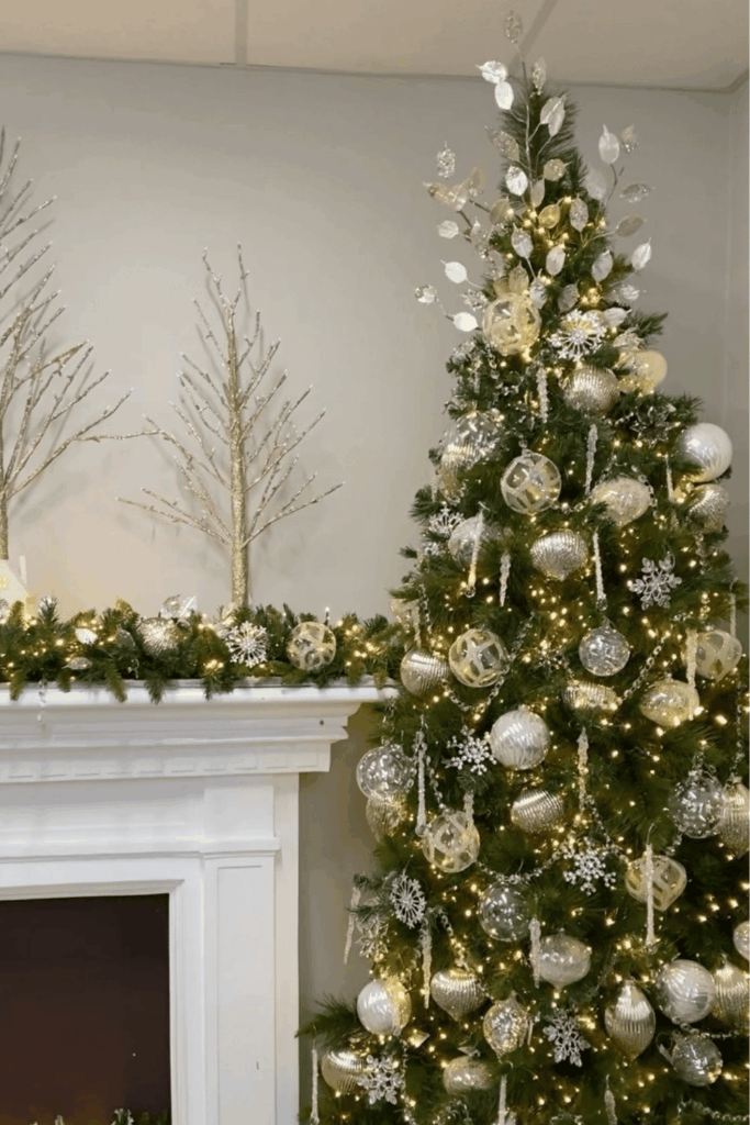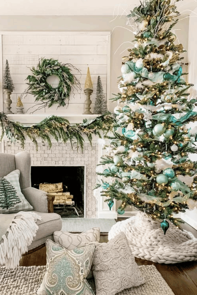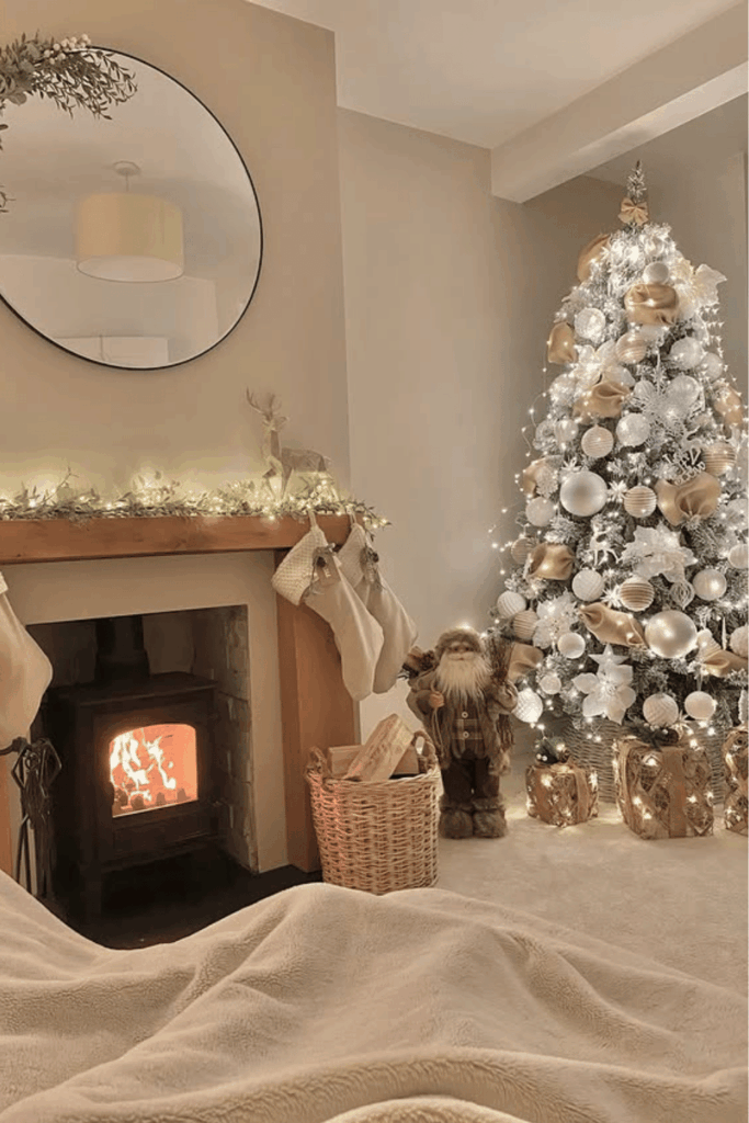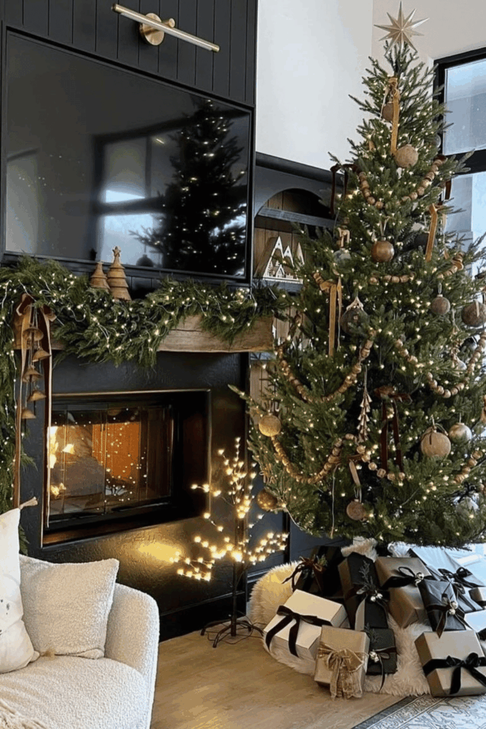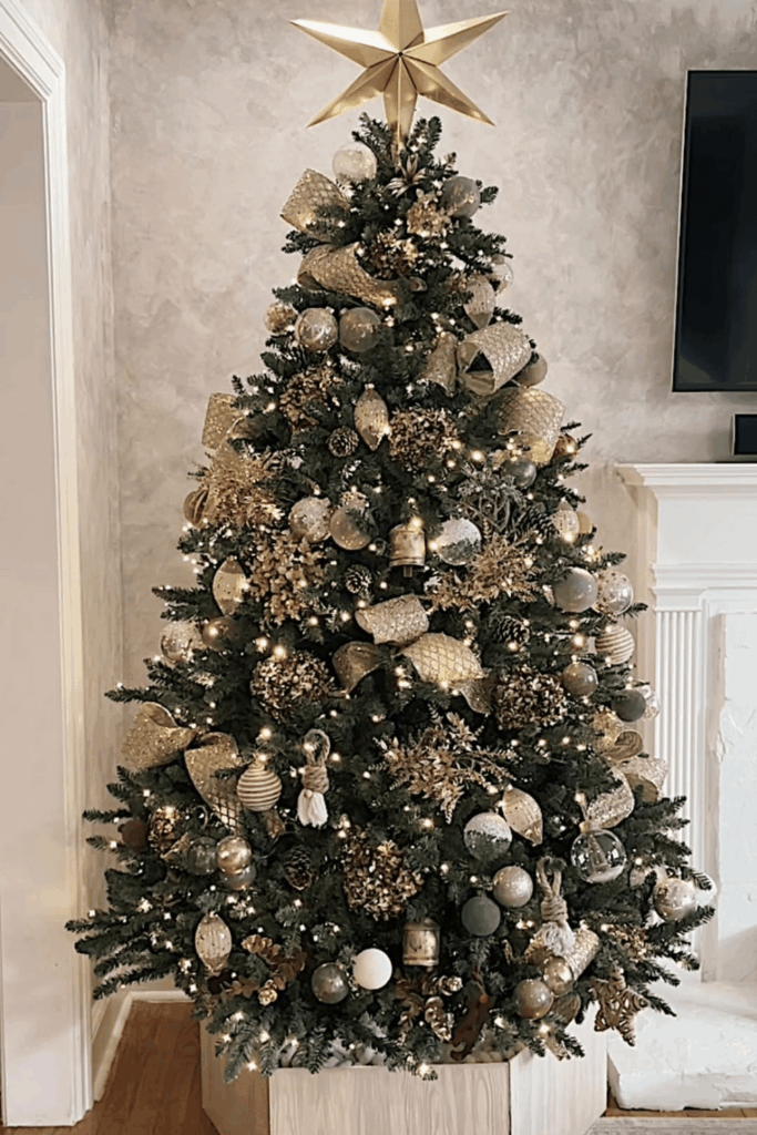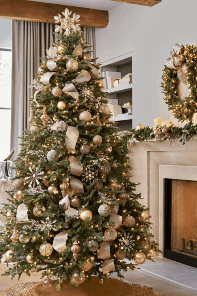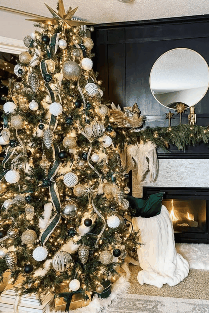 A gold-accented tree set next to the fireplace will warm up your home in no time.