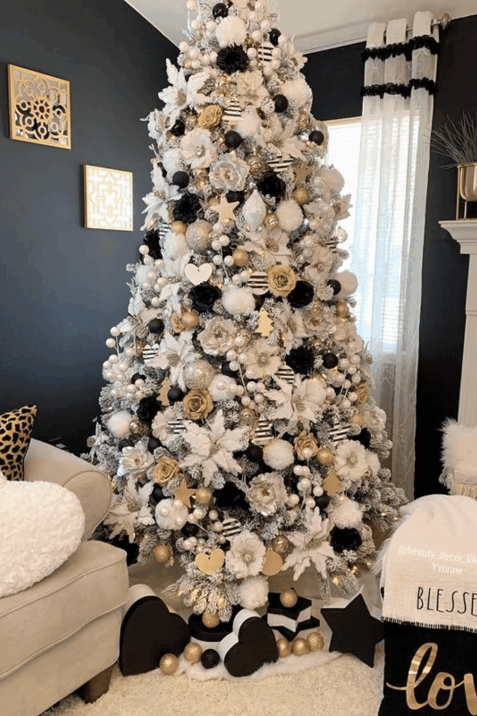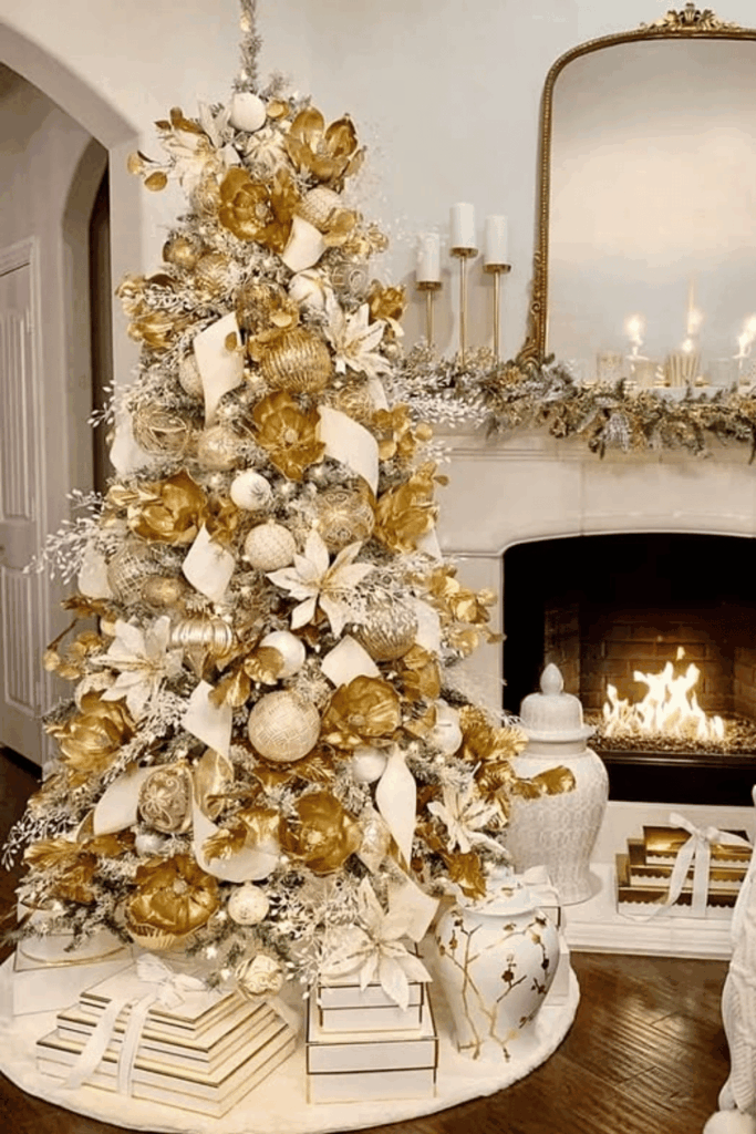 Large gold flowers and glossy ornaments add depth and dimension, and tiny white lights make the whole tree look warm and gorgeous.
