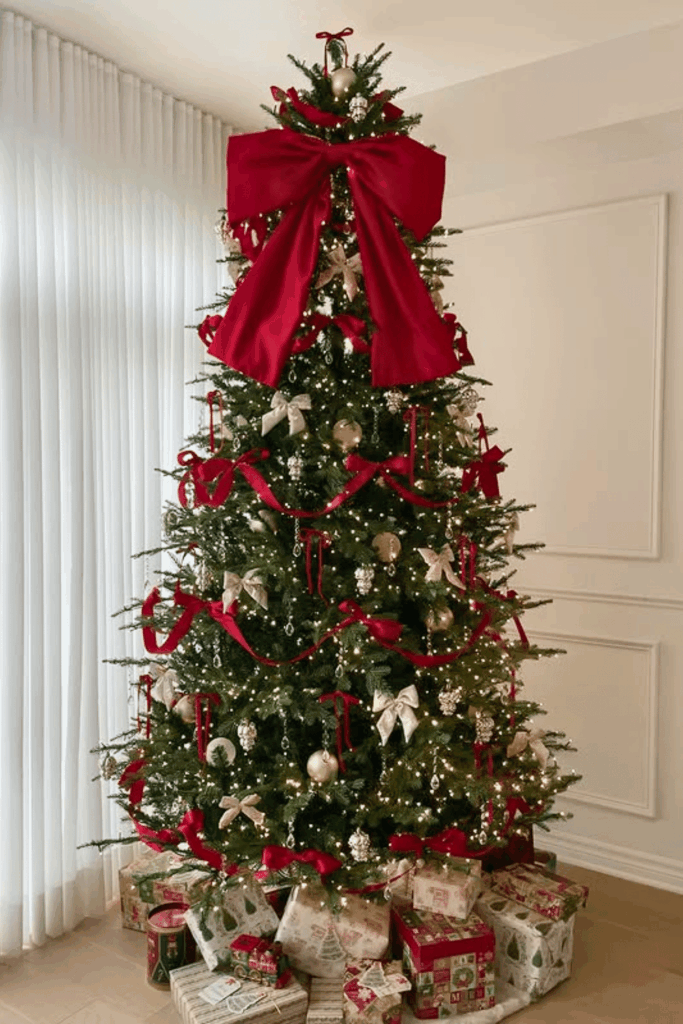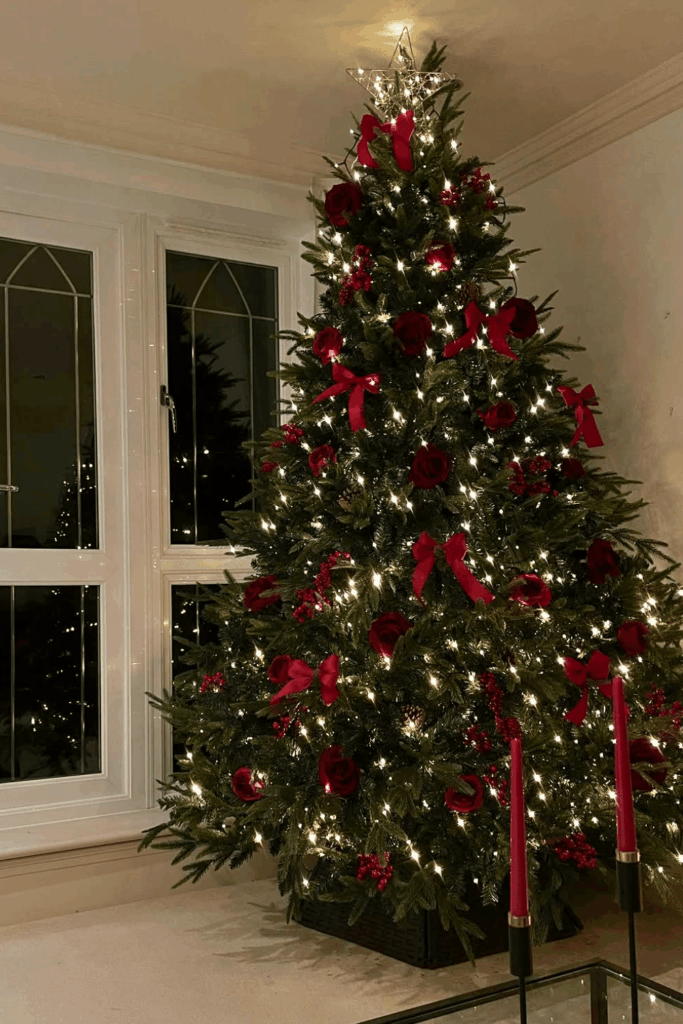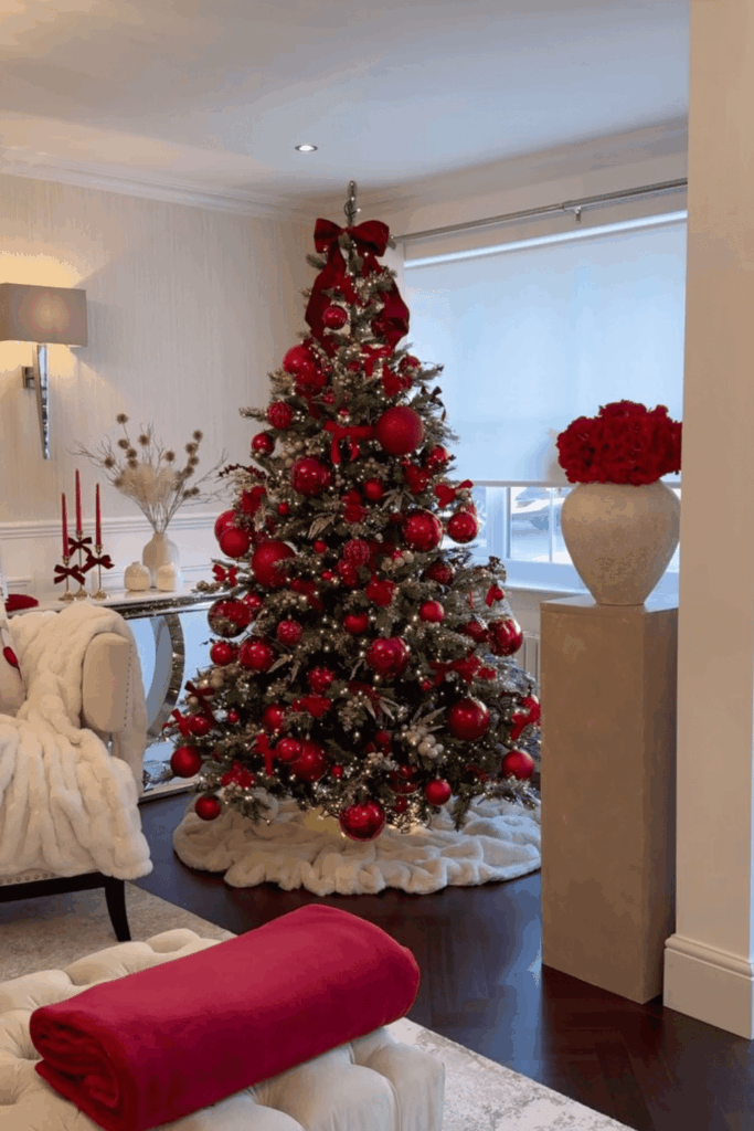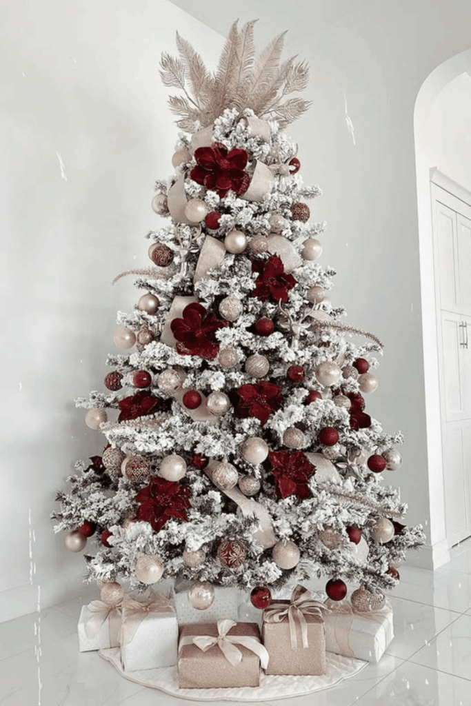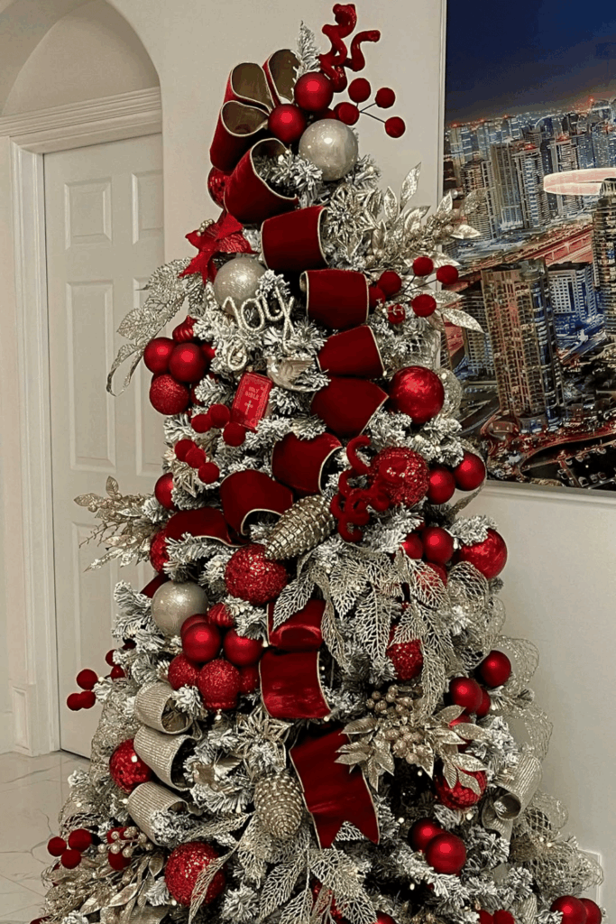 Nothing says Christmas quite like a red tree and this design keeps it timeless and luxurious with rich ruby ornaments, frosted branches, and a bold velvet bow topper.