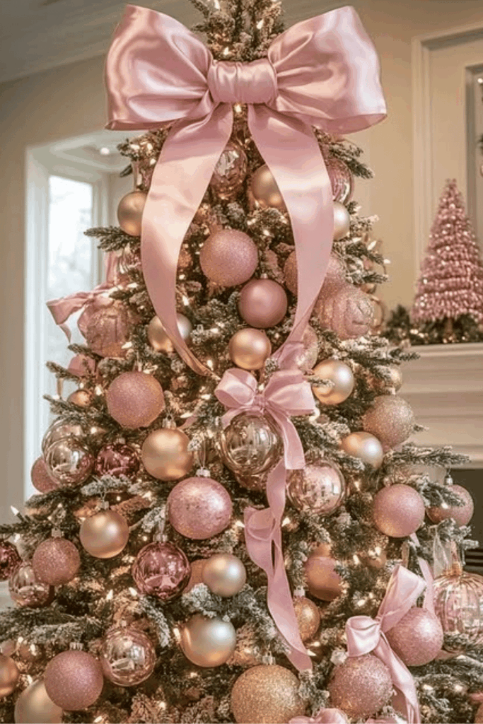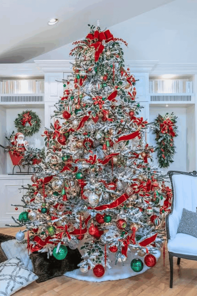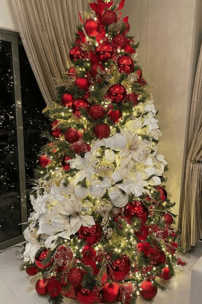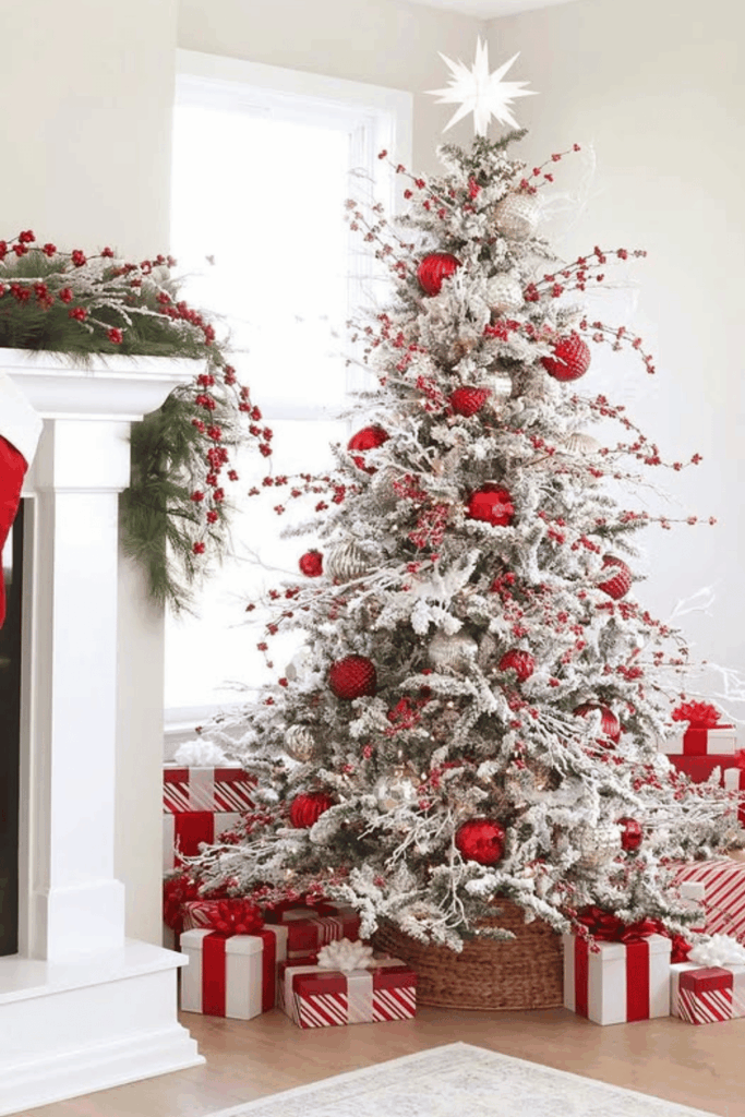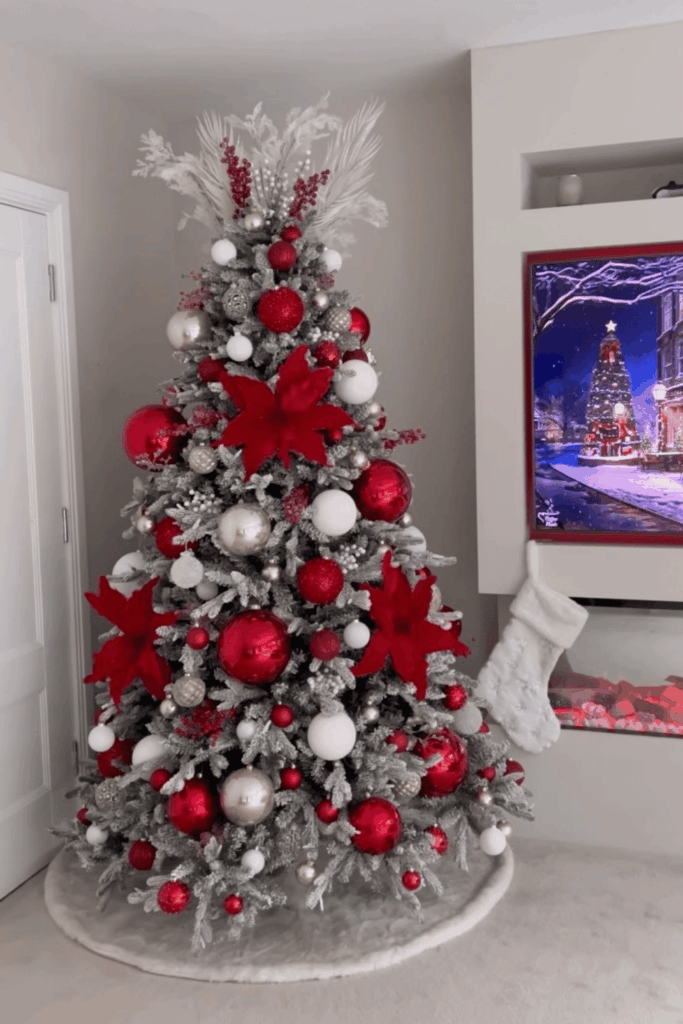 Nothing says Christmas quite like a red tree and this design keeps it timeless and luxurious with rich ruby ornaments, frosted branches, and a bold velvet bow topper.