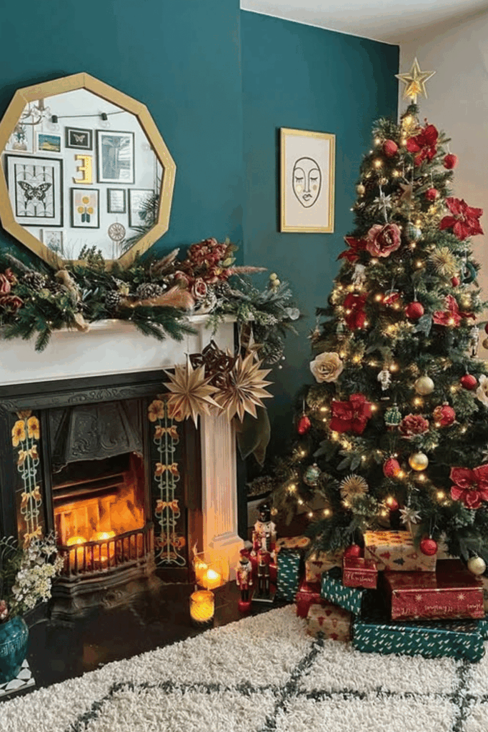 Make Your Fireplace Pop with a Luxurious Red, Green, and Gold Tree