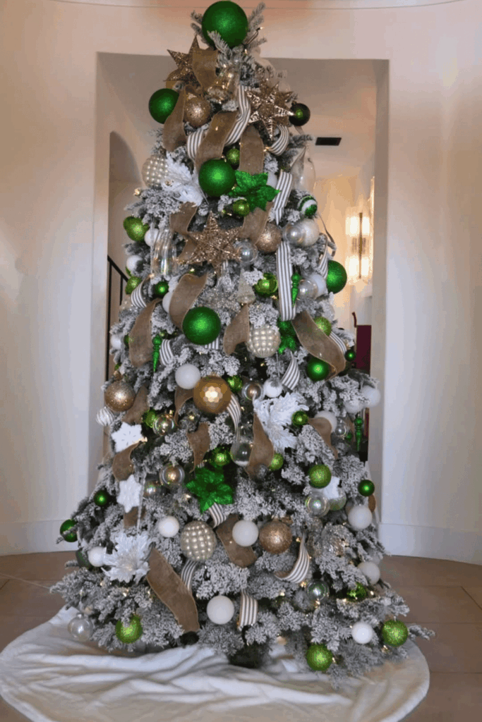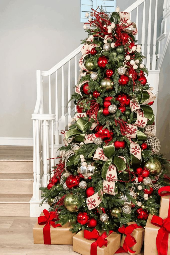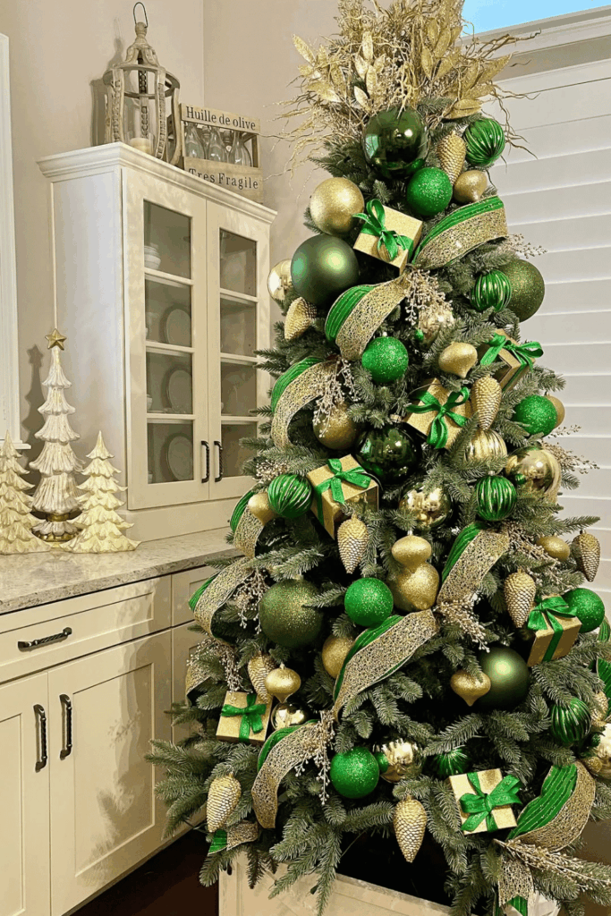 Combine green, red, and gold ornaments with burlap or patterned ribbons to add a cozy, homespun touch.