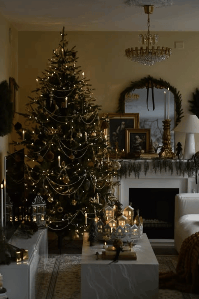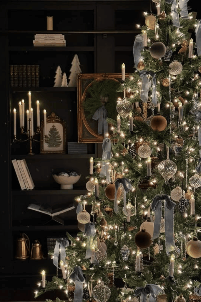 Soft candle lights tucked among the branches add a touch of old-world elegance.