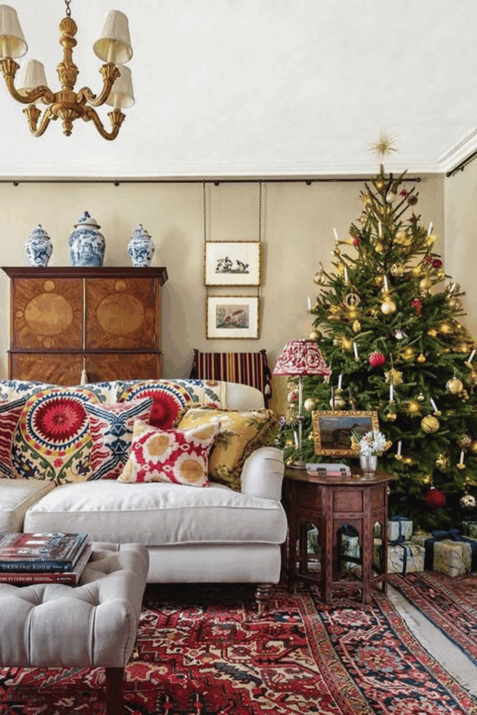 Pair your tree with dark forest green walls, deep burgundy flowers, and some golden accents for a rich and cozy palette.