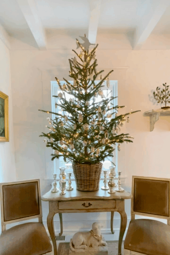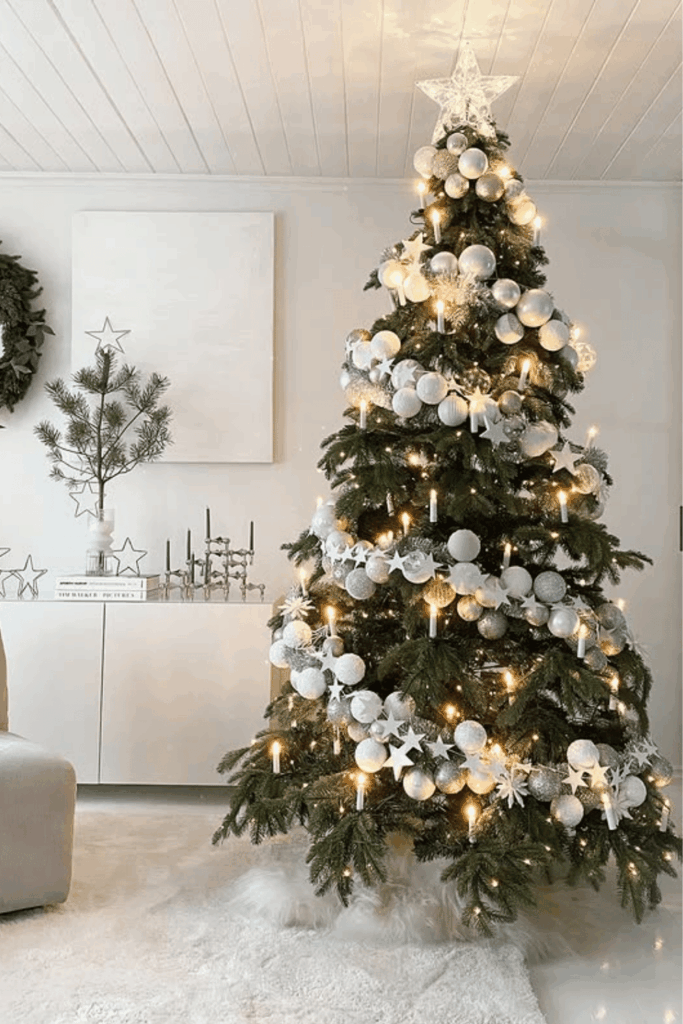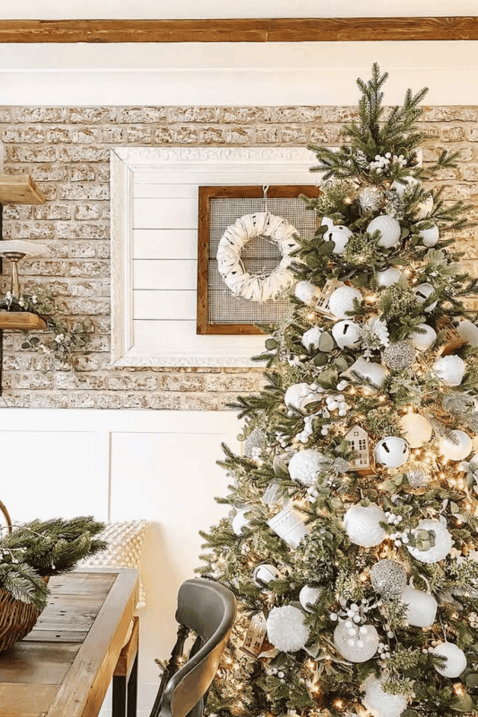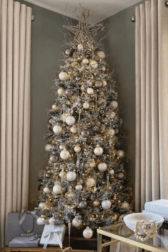 Decked out with sparkling white lights and a bunch of larger ornaments at the top of the tree, this is an elegant nod to traditional Christmas styling.