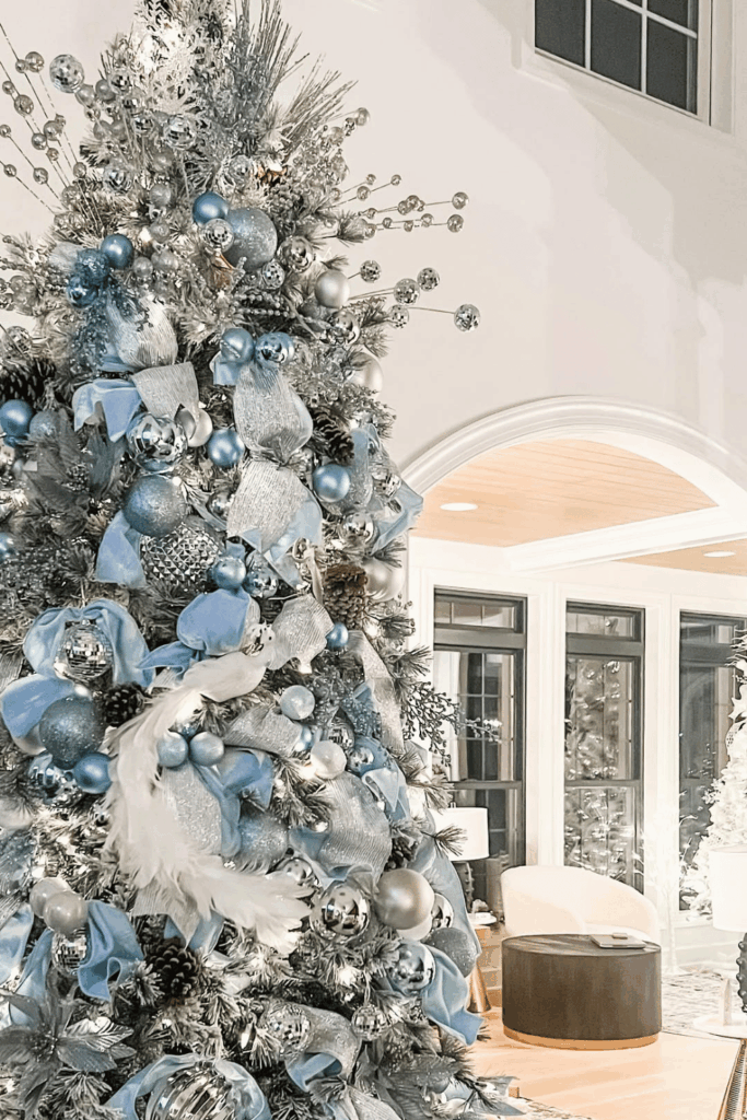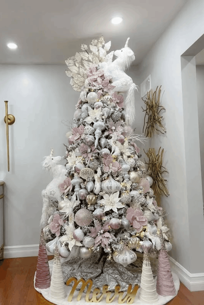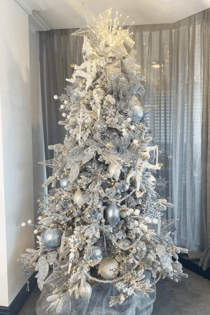 Minimal and modern, this tree shows you that you don’t have to fill every branch to have a beautiful display. By using one color palette… silver and white, the tree stays clean and crisp.
