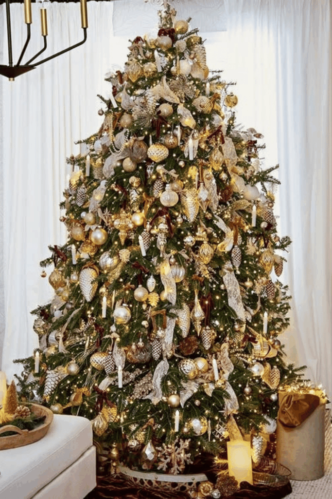 Warm white lights, golden ornaments, and pretty ribbons make this a cozy and collected looking tree.