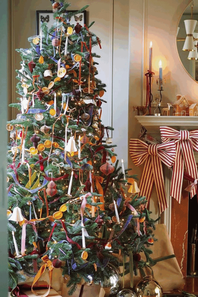 Dried oranges, ribbon garlands, sweetly offbeat handmade ornaments, and a rainbow of colors bring old-fashioned cheer to this sweet and cozy tree.