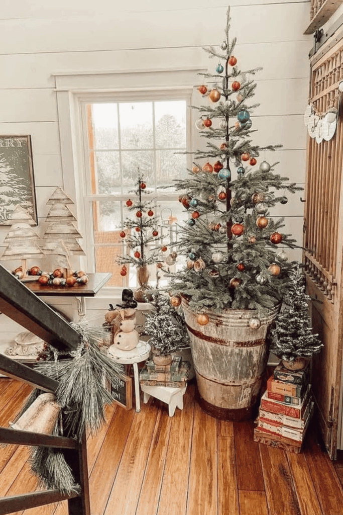 A galvanized bucket to stand your tree in, a few mismatched smaller ornaments, and some vintage books or wooden toys scattered on the floor makes this little tree a nostalgic, and small space, dream.