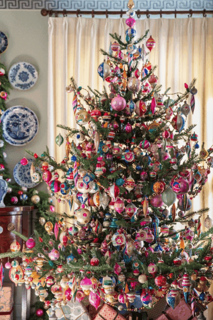Color it all over with this tree dripping with vintage glass ornaments in pinks, turquoises, gold, and reds.