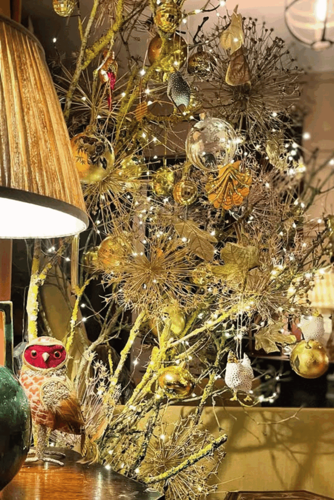 Made from foraged golden dried branches and festooned with tiny fairy lights, twinkling baubles and a stunning mix of decorations, this playful take on a Christmas tree is 100% unique, gloriously festive and gives any home a stylishly warm and eclectic vibe.