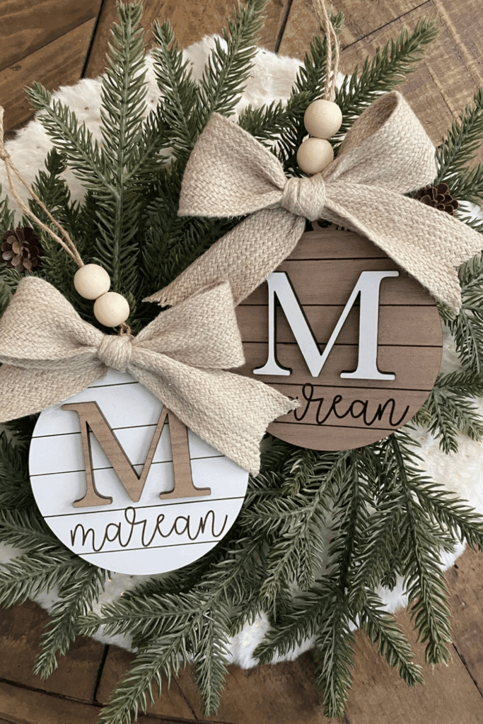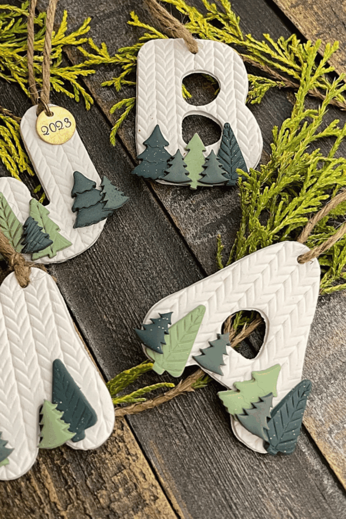 I adore these monogram clay ornaments with little evergreen trees! They have a rough texture and earthy tones which give them a very homey, handcrafted look.