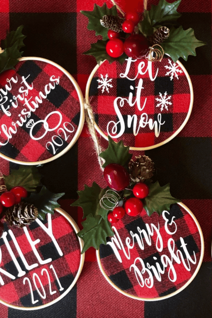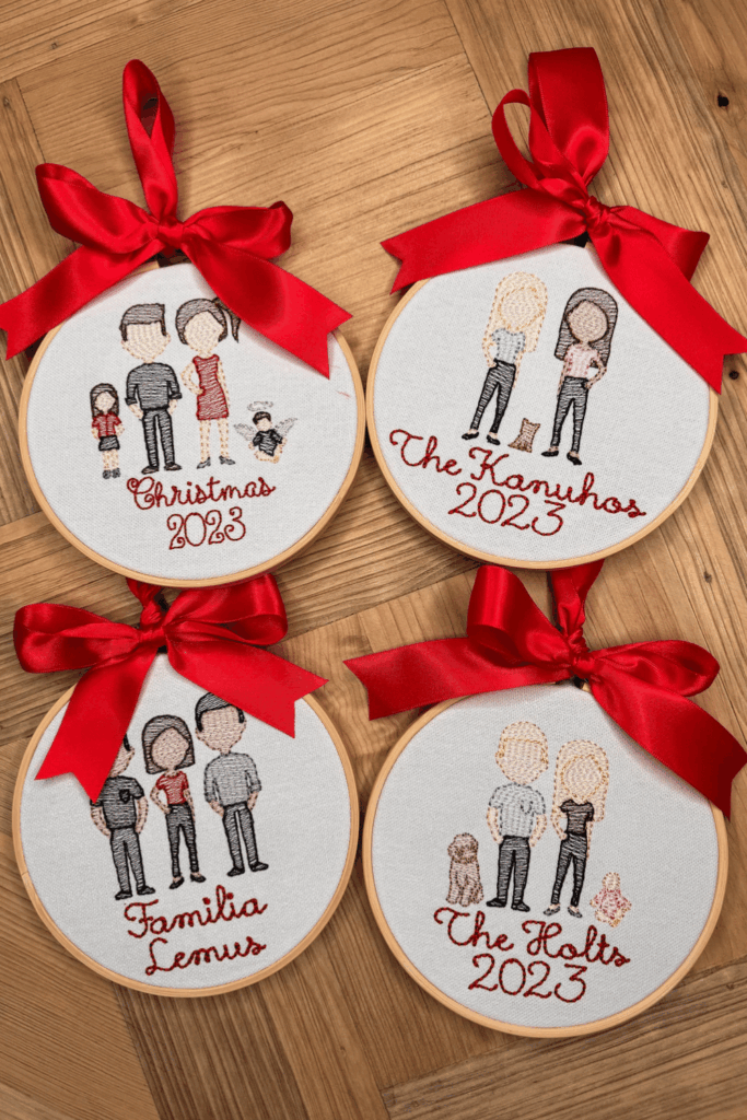 These custom family embroidery hoops hung with festive ribbon are just so special!