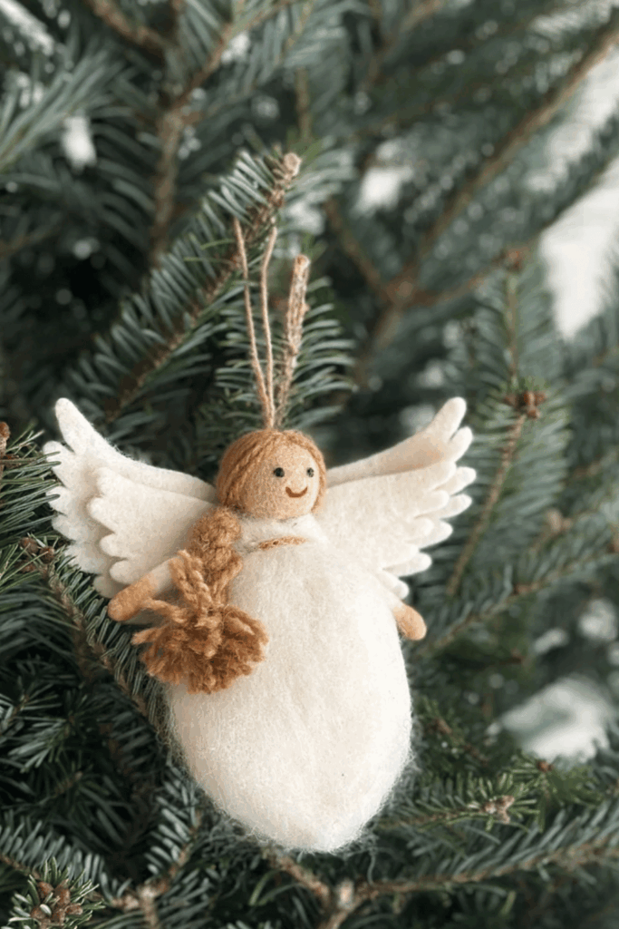 The sweet and fuzzy felted angel brings a handmade element to the tree.