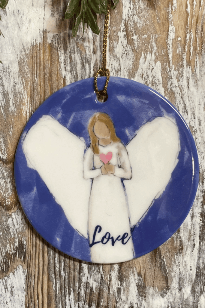 This disc-shaped ornament features a hand-painted angel holding a love heart radiating peace and goodwill.