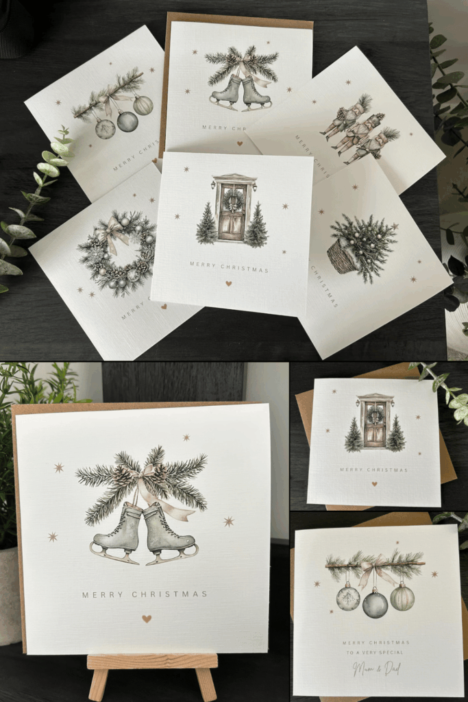 Illustrated with delicate wintry scenes of pine sprigs, baubles and skates, these rustic yet chic Christmas cards are ideal for mailing to loved ones or tucking into homemade gifts.