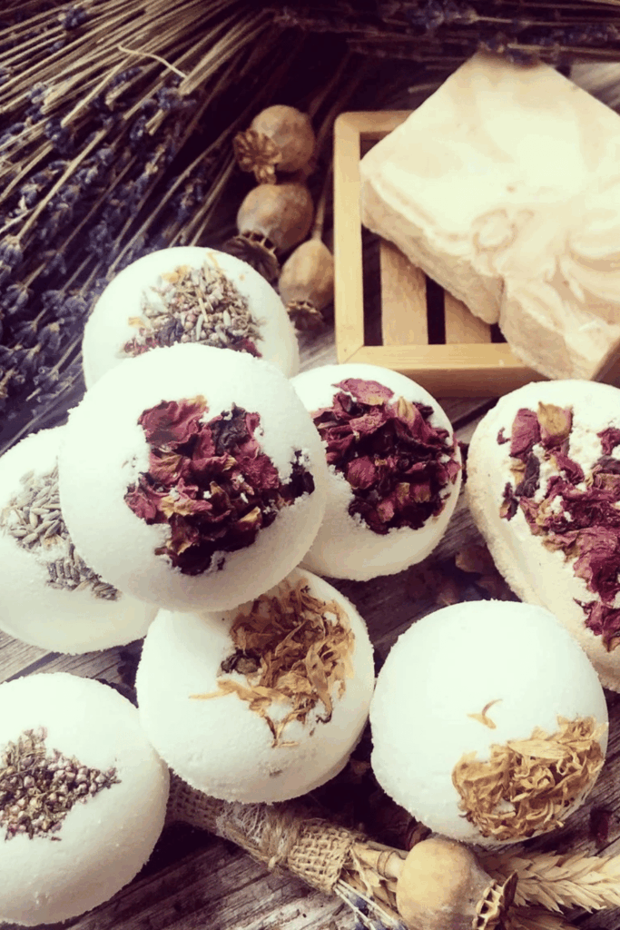 Create a thoughtful gift for any home-bath lover by gifting one of these handmade bath bombs topped with dried flowers and herbs.