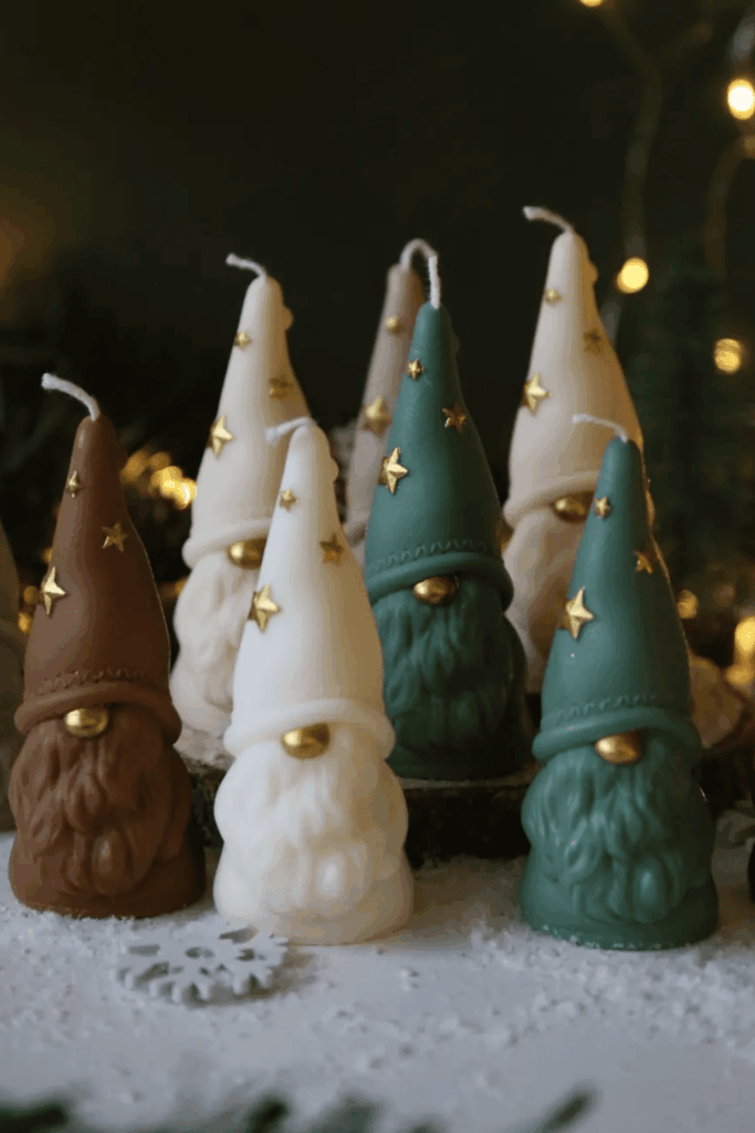 Tiny pointed hats and snowy textures transport these gnome candles straight from the homey magic of Christmas.
