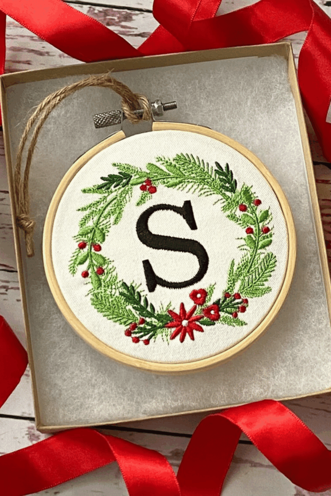 Timeless, elegant and full of festive spirit, this monogrammed hoop with a lush wreath around the initial is just beautiful!